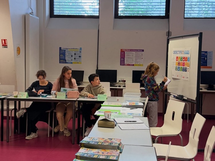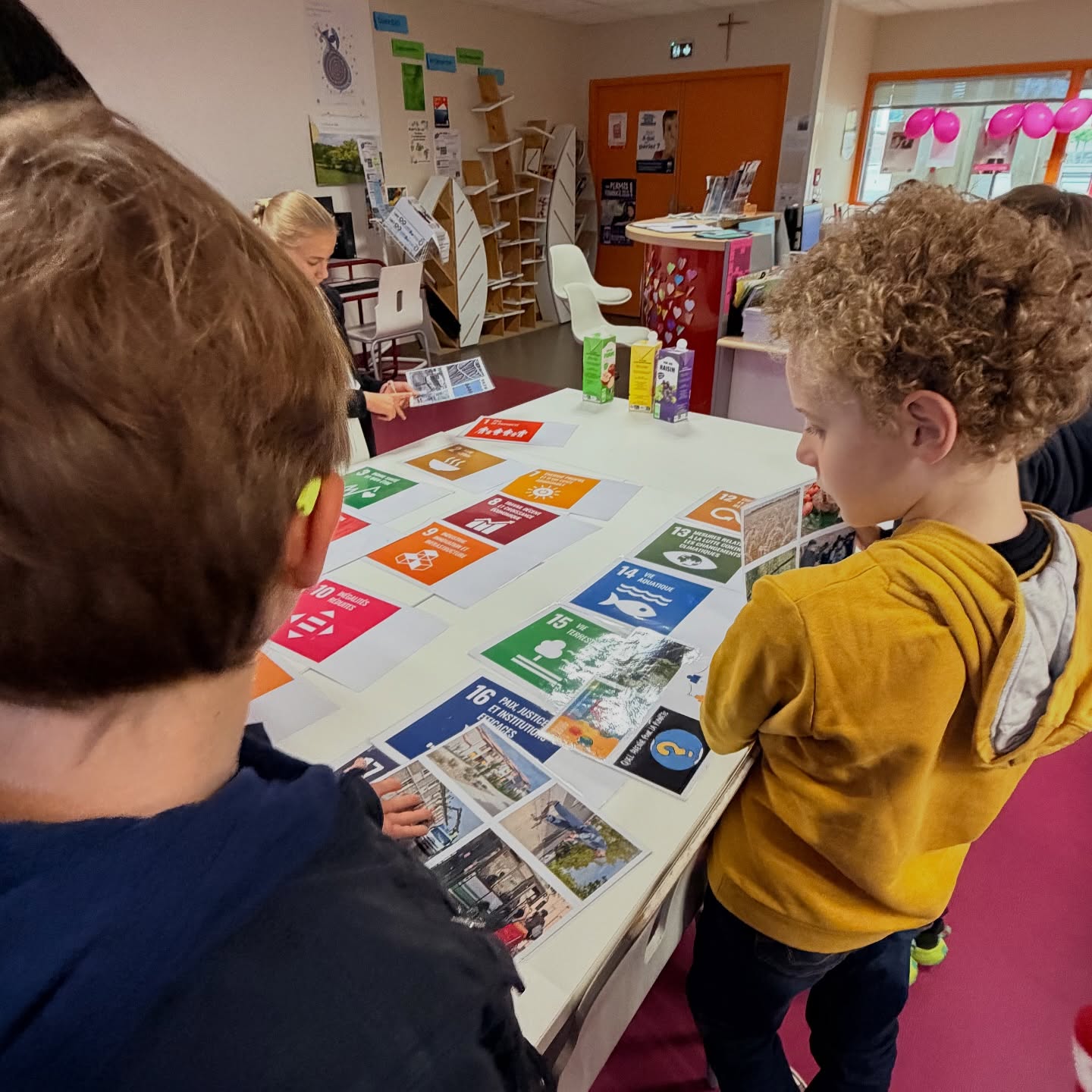 La matinée s’est poursuivie avec la découverte des Objectifs de Développement Durable (ODD) à travers deux vidéos – l’une sur l’ONU, l’autre sur « Good Planet » – et un jeu collaboratif qui a permis d’aborder ces grands enjeux mondiaux de façon ludique et participative.