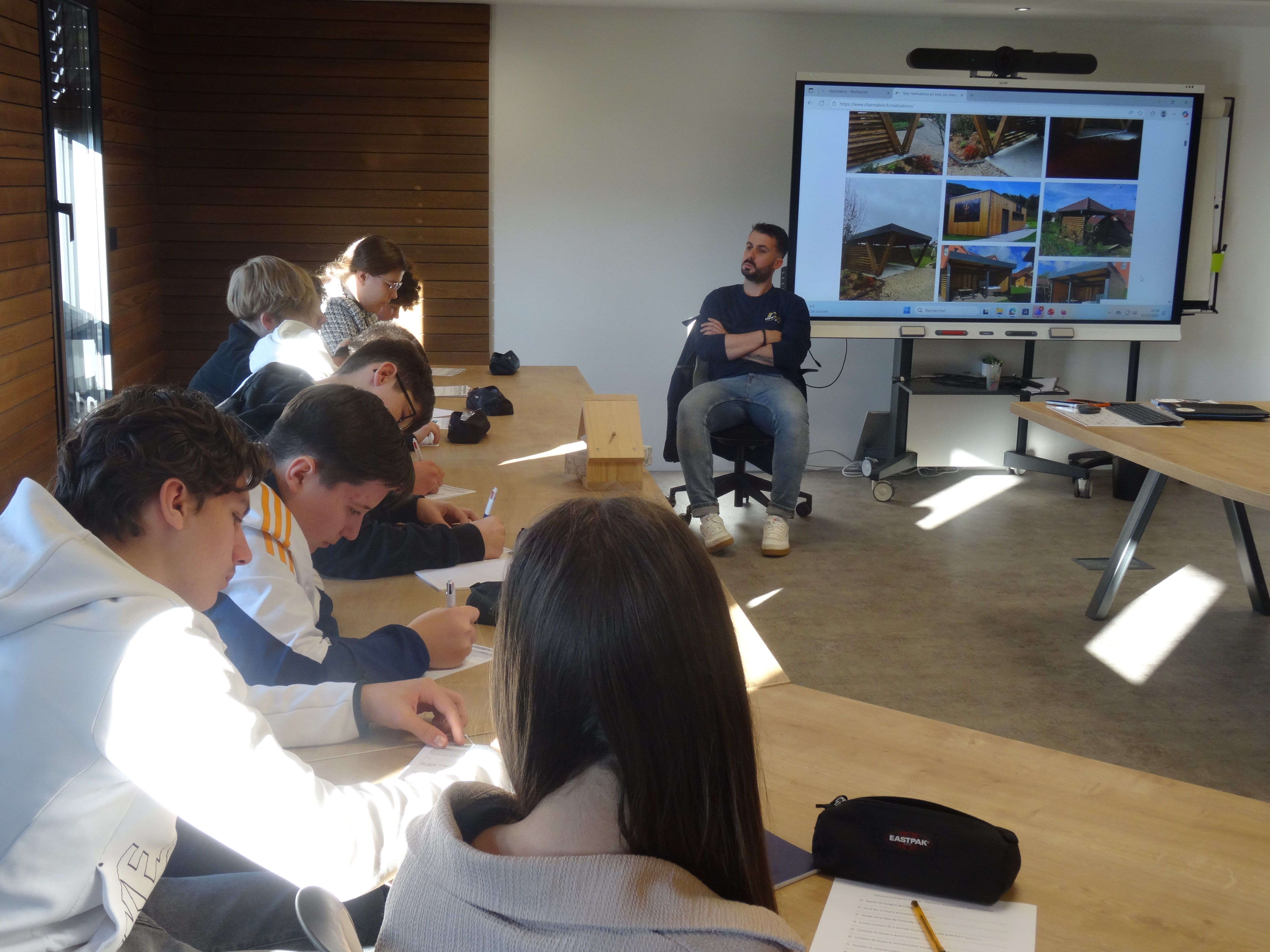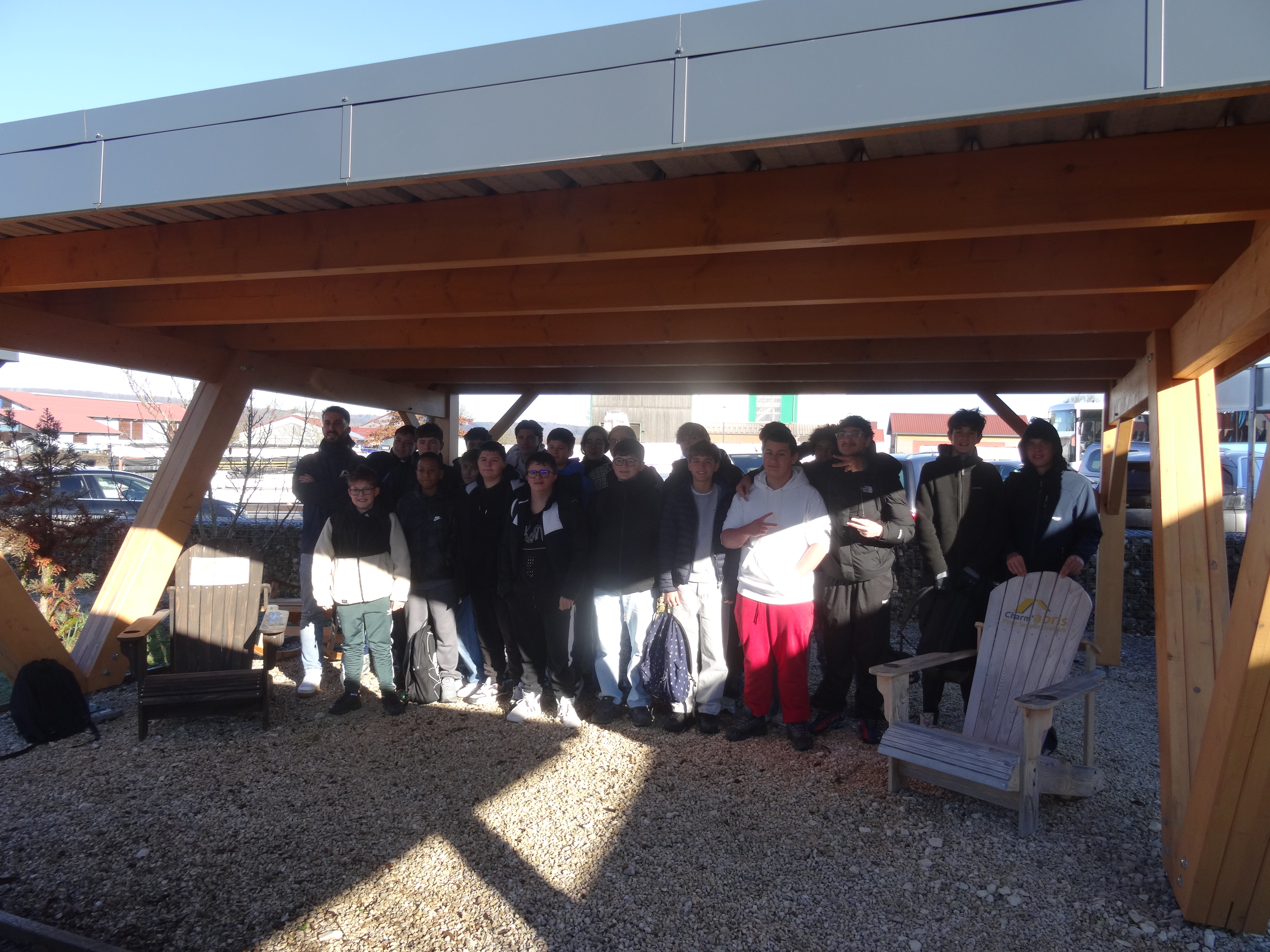 En vue de participer au concours "Entreprise à la Une", les élèves de 3e Prépa-métiers visitent Charm'abris à Etalans, spécialisée dans la construction de structures en bois pour les particuliers. C'est une extension de Charm'ossature.
